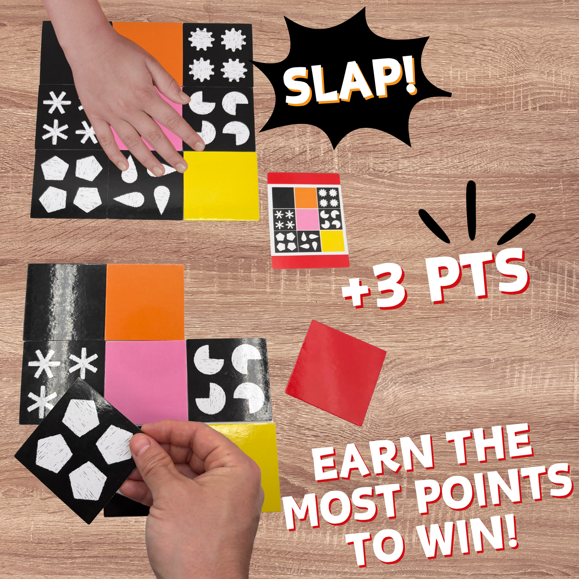 Players compete to match their set of 9 tiles to the 3x3 grid shown on the flipped match card. With a mix of colors and patterns, players must race against each other to be the first to correctly orient their tiles and slap the card to claim the card’s points.