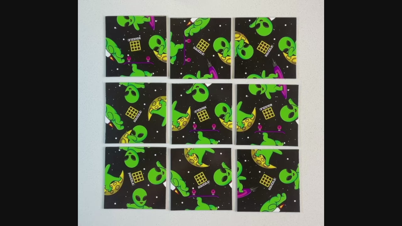 Designed for convenience, Squzzles come packaged in a compact 4.5"x 4.5" x 0.5" bag. Each Squzzle piece measures 3in x 3in with the entire puzzle measuring 9in x 9in when arranged in a 3x3 playing grid to solve. Play at a restaurant, on an airplane or at home- Squzzles are the perfect brain game.