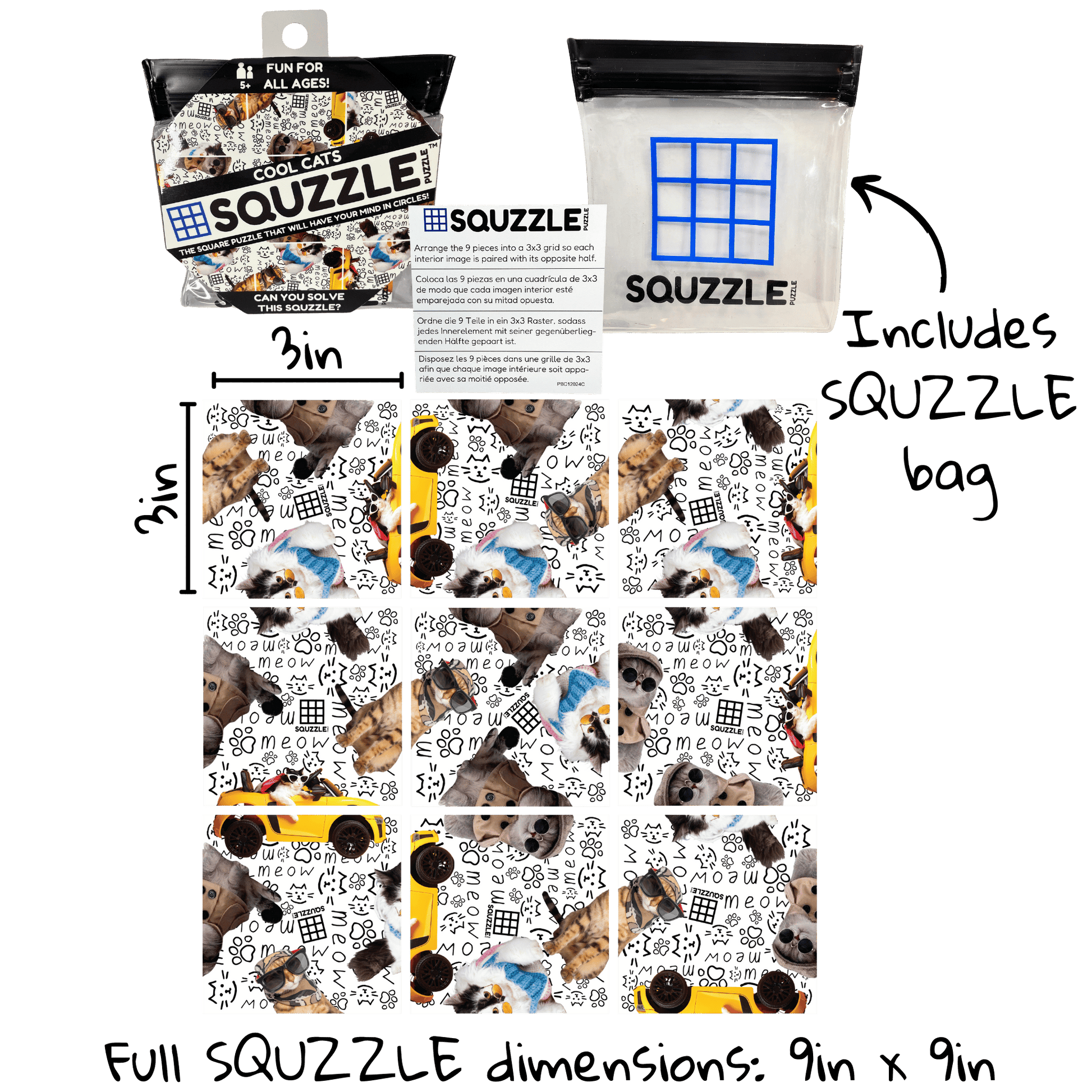 Discover Squzzle Puzzles – a captivating 9-piece brain teasing square puzzle that will have your mind in circles! Arrange and rearrange the pieces into a 3x3 grid so each interior image has a match with its opposite half. Twist and turn your way through this mesmerizing square puzzle that will have your mind spinning!