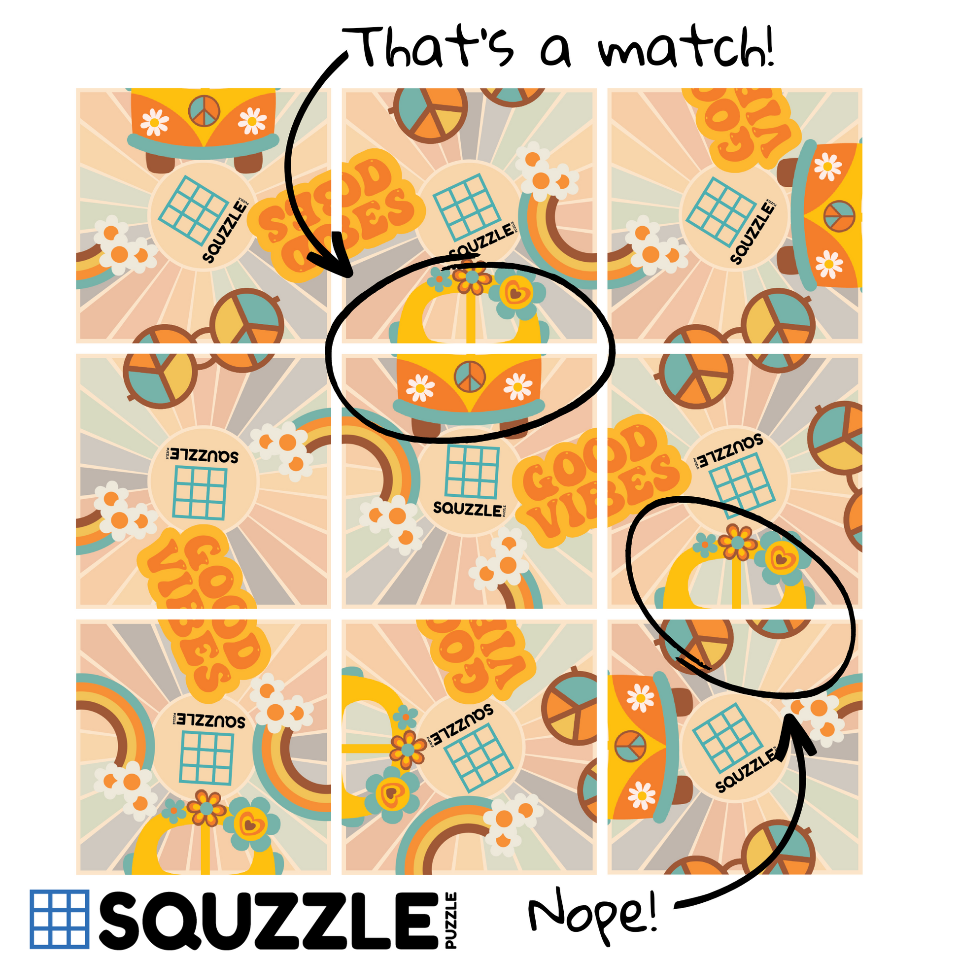 Discover Squzzle Puzzles – a captivating 9-piece brain teasing square puzzle that will have your mind in circles! Arrange and rearrange the pieces into a 3x3 grid so each interior image has a match with its opposite half. Twist and turn your way through this mesmerizing square puzzle that will have your mind spinning!