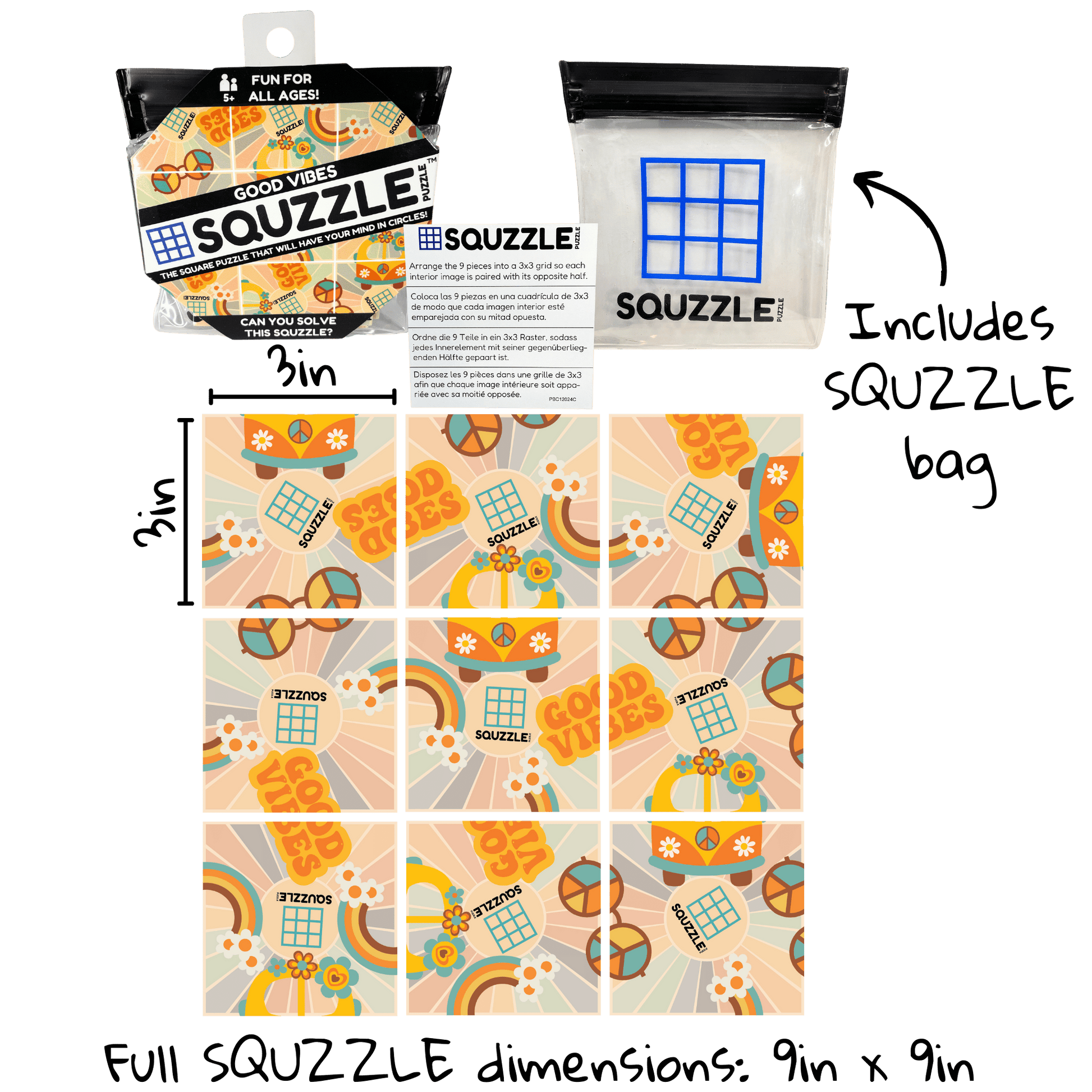 Designed for convenience, Squzzles come packaged in a compact 4.5"x 4.5" x 0.5" bag. Each Squzzle piece measures 3in x 3in with the entire puzzle measuring 9in x 9in when arranged in a 3x3 playing grid to solve. Play at a restaurant, on an airplane or at home- Squzzles are the perfect brain game.