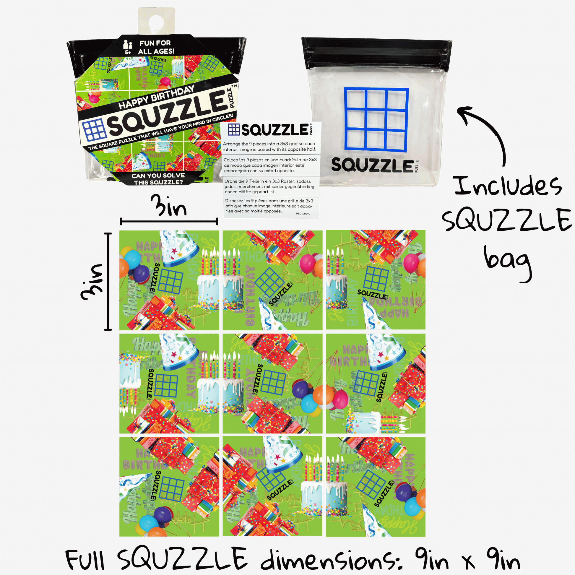 Designed for convenience, Squzzles come packaged in a compact 4.5"x 4.5" x 0.5" bag. Each Squzzle piece measures 3in x 3in with the entire puzzle measuring 9in x 9in when arranged in a 3x3 playing grid to solve. Play at a restaurant, on an airplane or at home- Squzzles are the perfect brain game.