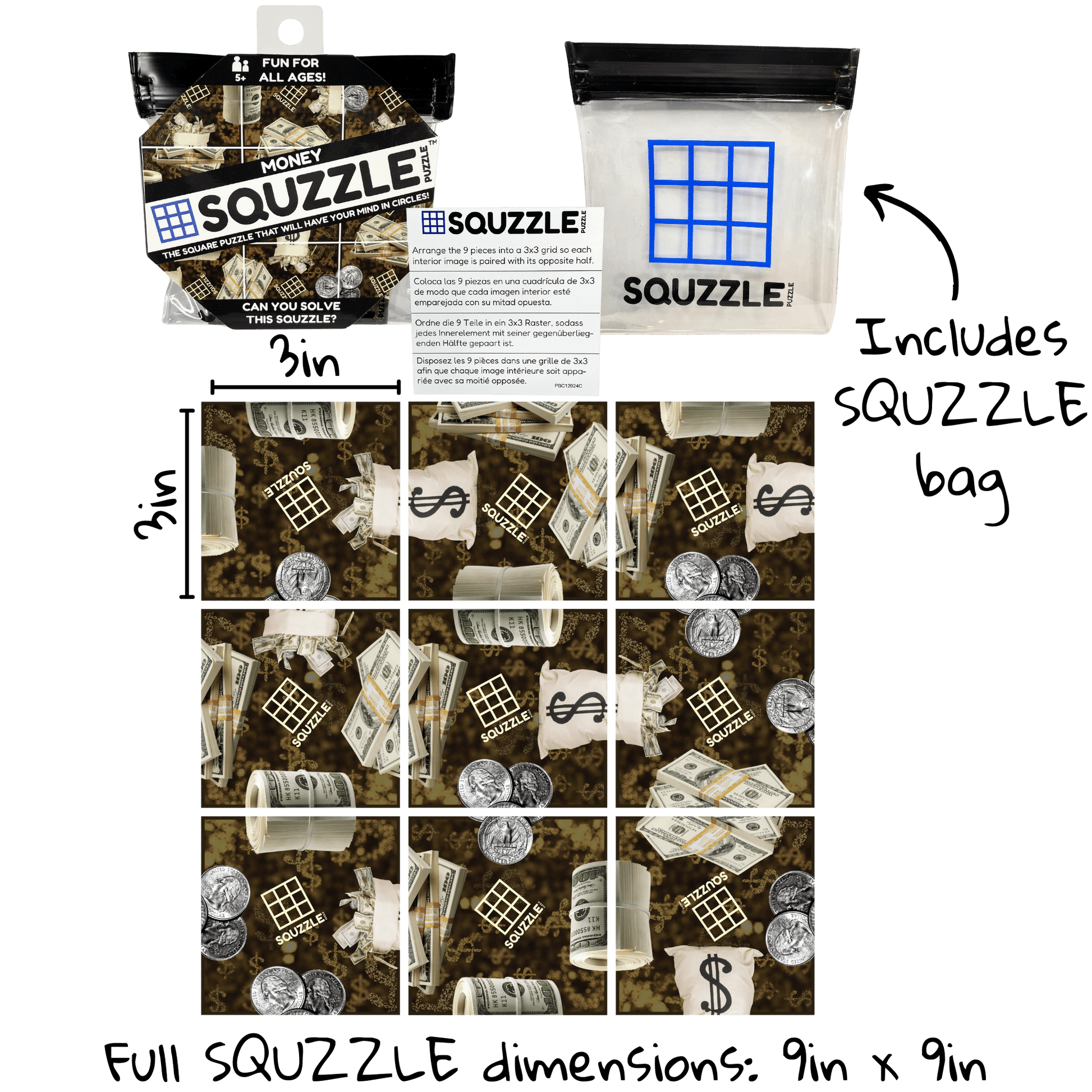 Designed for convenience, Squzzles come packaged in a compact 4.5"x 4.5" x 0.5" bag. Each Squzzle piece measures 3in x 3in with the entire puzzle measuring 9in x 9in when arranged in a 3x3 playing grid to solve. Play at a restaurant, on an airplane or at home- Squzzles are the perfect brain game.