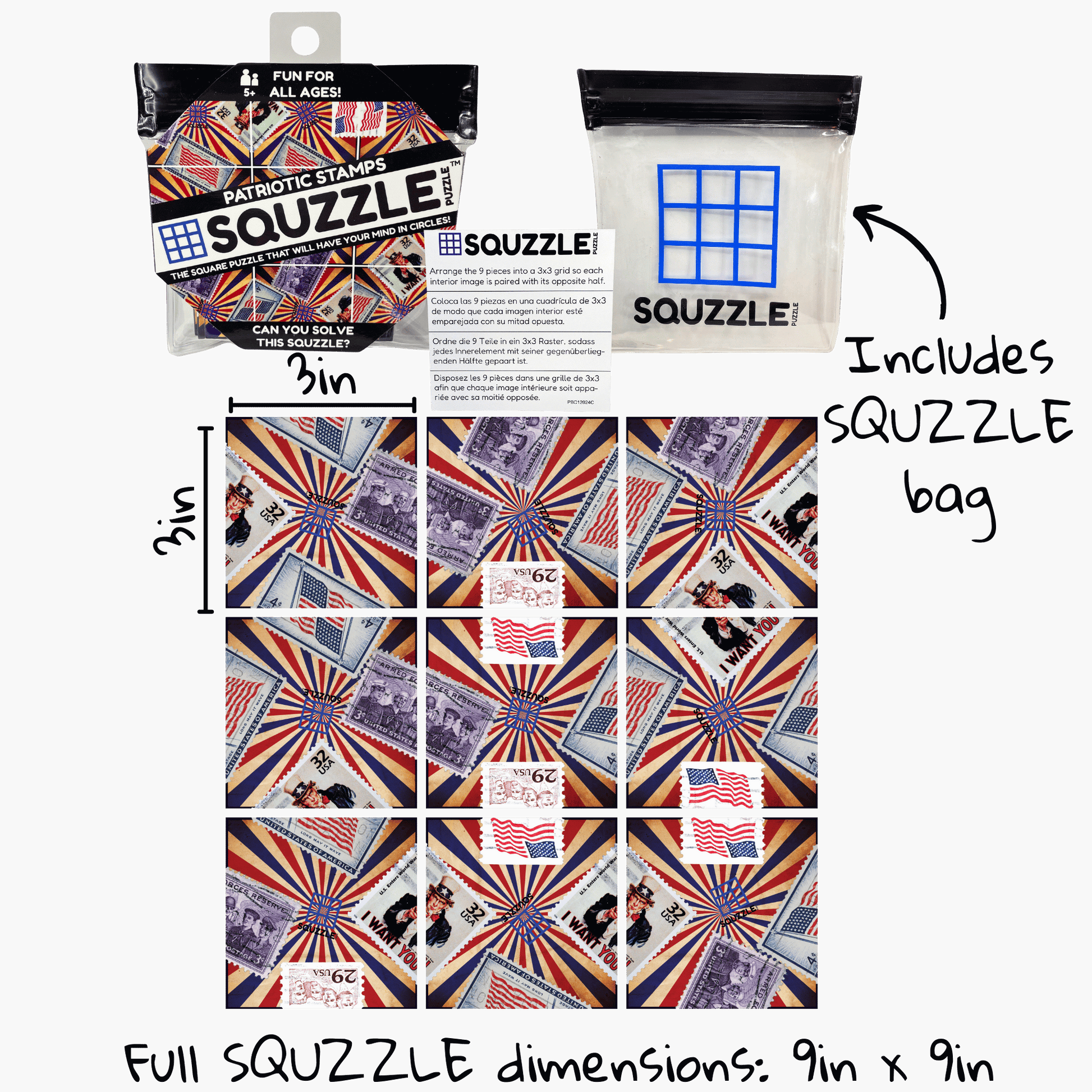Designed for convenience, Squzzles come packaged in a compact 4.5"x 4.5" x 0.5" bag. Each Squzzle piece measures 3in x 3in with the entire puzzle measuring 9in x 9in when arranged in a 3x3 playing grid to solve. Play at a restaurant, on an airplane or at home- Squzzles are the perfect brain game.