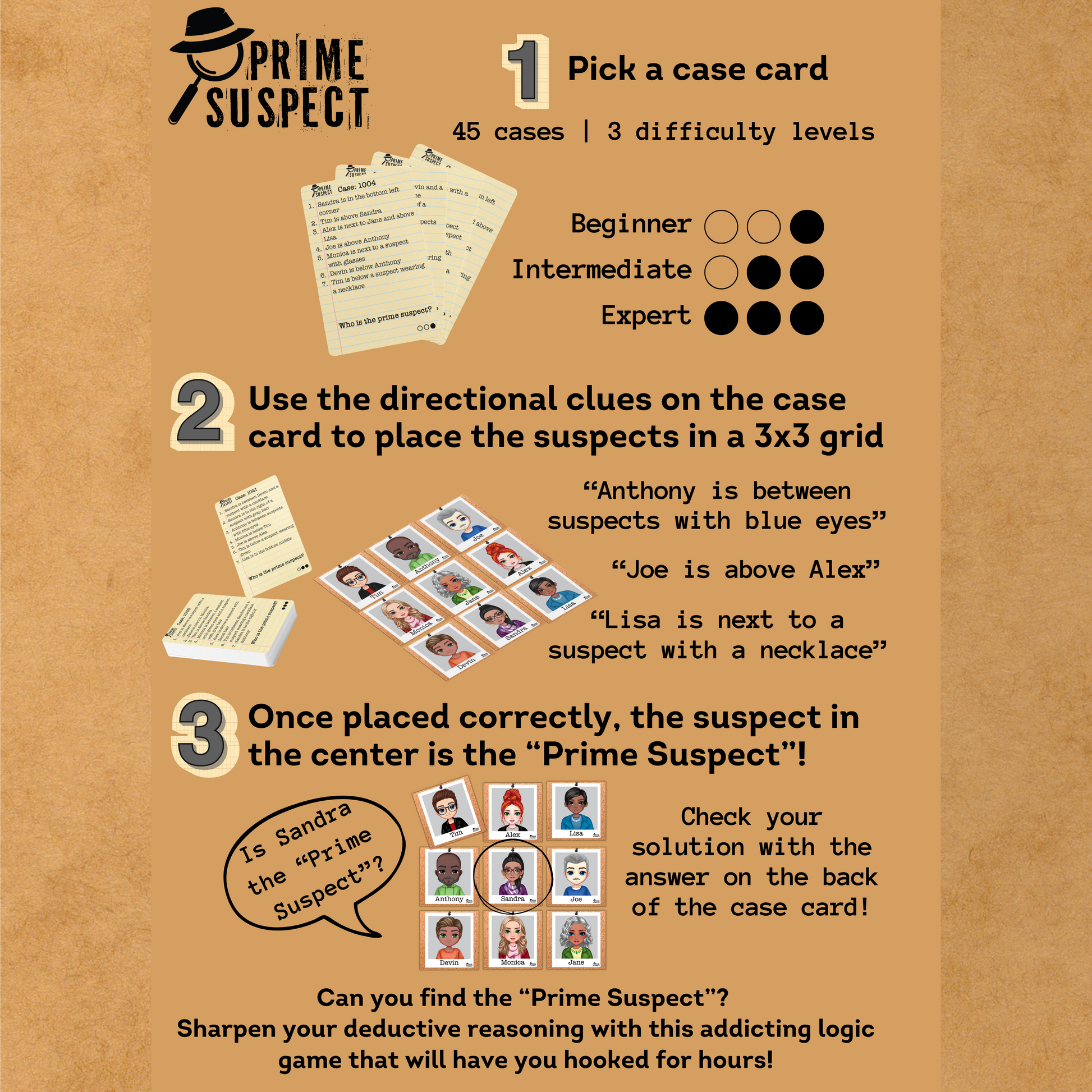 Prime Suspect is a captivating deduction game designed for 1 player. It challenges players to strategically arrange suspect tiles based on provided clues to unveil the "Prime Suspect" at the center of the case. With varying difficulty levels and two distinct gameplay modes, Prime Suspect promises hours of thrilling entertainment.
