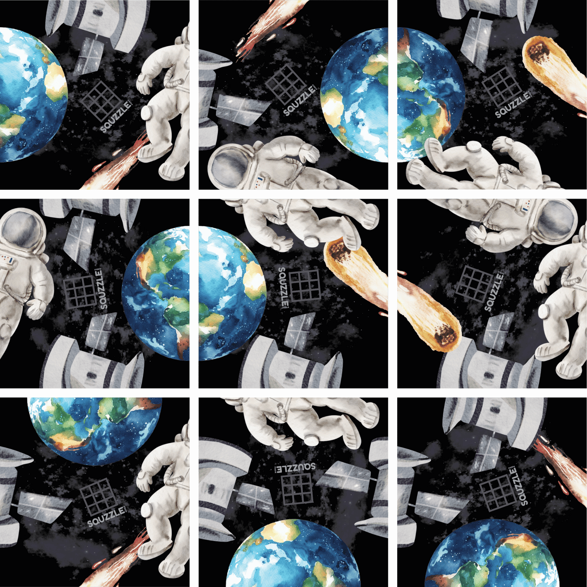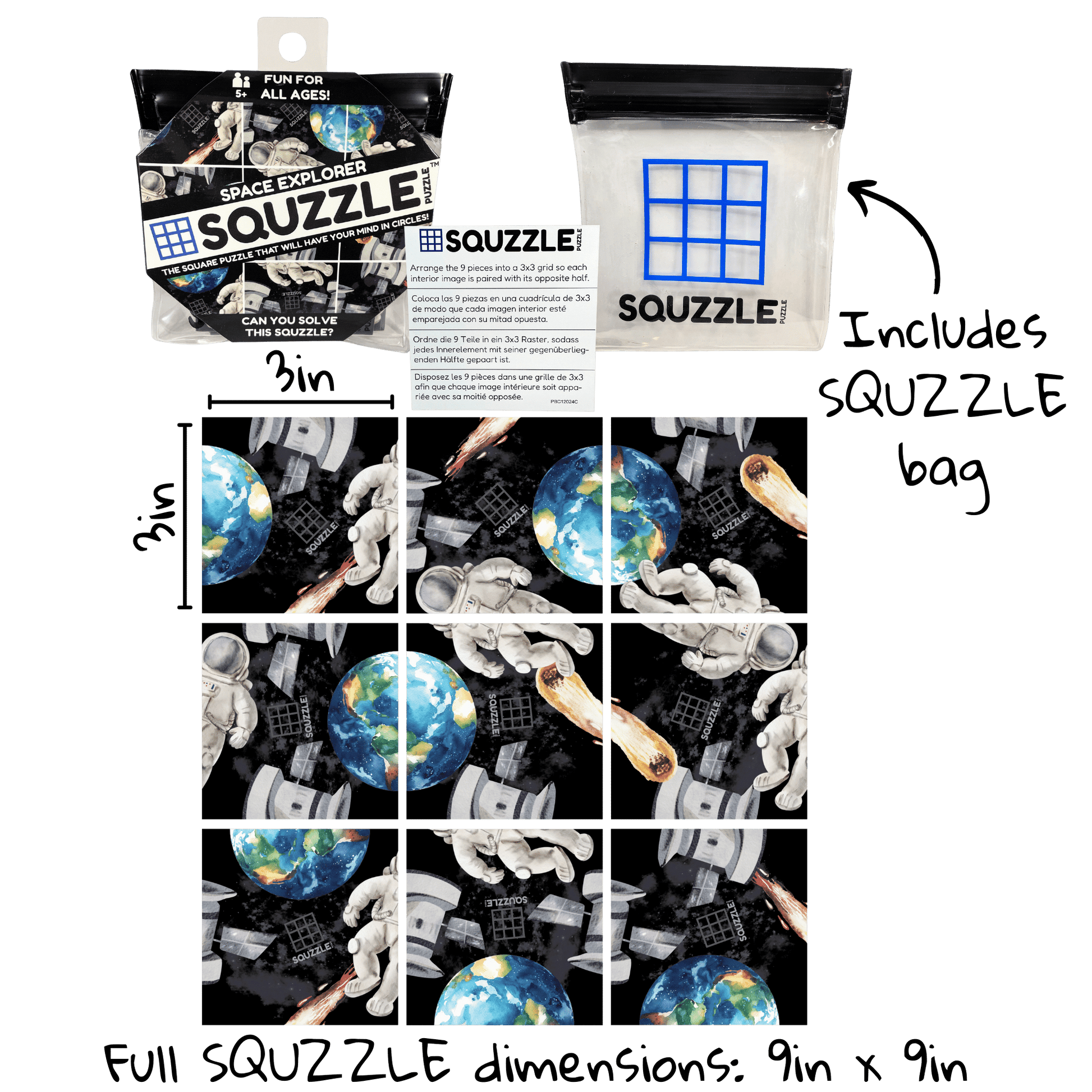 Designed for convenience, Squzzles come packaged in a compact 4.5"x 4.5" x 0.5" bag. Each Squzzle piece measures 3in x 3in with the entire puzzle measuring 9in x 9in when arranged in a 3x3 playing grid to solve. Play at a restaurant, on an airplane or at home- Squzzles are the perfect brain game.